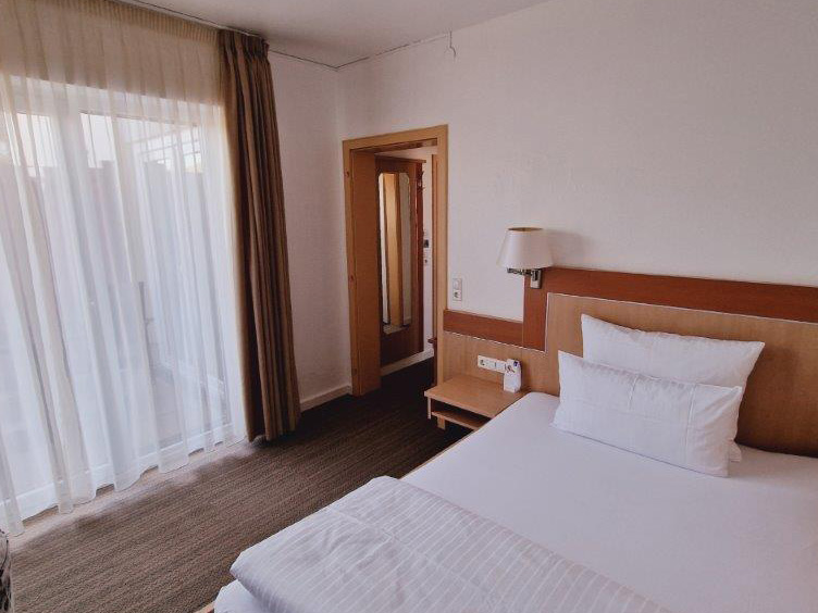 Ein komfortables Schlafzimmer mit einem großen Bett und einer schönen Aussicht. Nicht jedes Zimmer verfügt über einen Balkon, aber auf Anfrage kann ein Zimmer mit großem Balkon und Blick auf Metzingen reserviert werden.